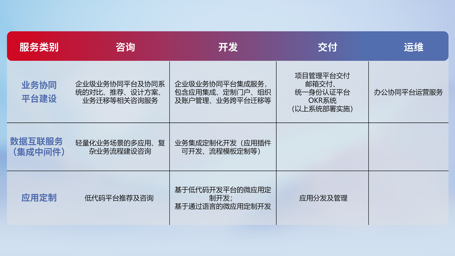 针对钉钉、、、、企微、、、、IDaas等平台级产品提供产品的规划、、、方案、、、交付、、定制化开发等服务,,,,实现如统一协同办公、、、智能客户服务、、、、混合会议管理、、智能数据查询、、、等业务场景,,,,实现数字化转型。。。。