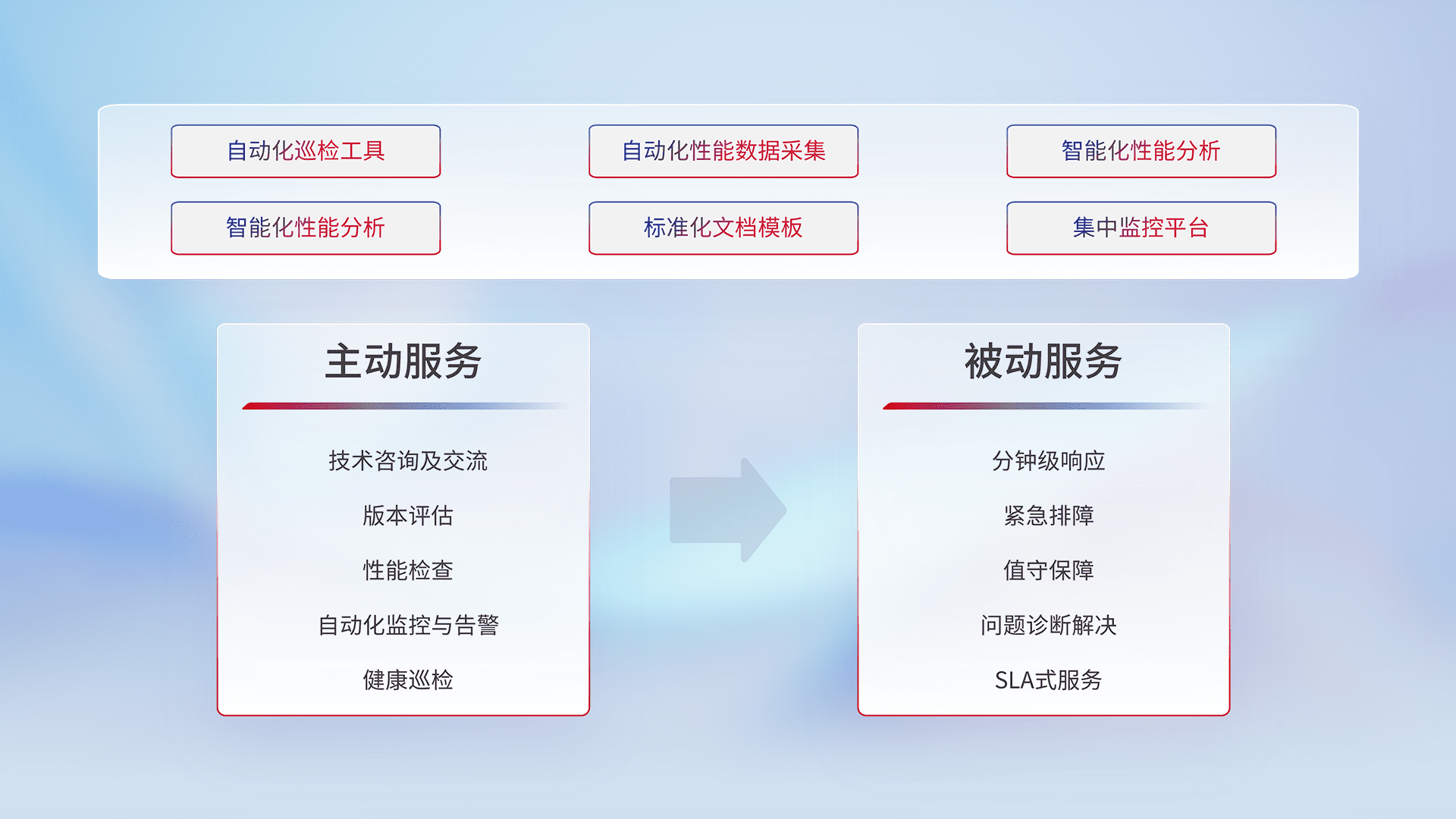智能化工具和标准化文档,,,,保障服务质量,,,提供主动服务(包含技术咨询、、、版本评估、、、、性能检查、、、、自动化监控与告警、、健康巡检)和被动服务包含(分钟级响应、、、、紧急排障、、、、值守保障、、问题诊断解决、、SLA服务)。。。