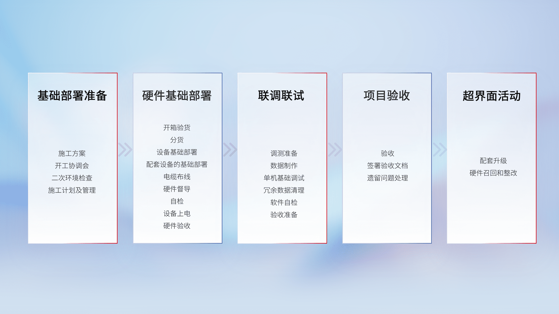 从基础部署准备、、硬件基础部署、、、联调联试、、、、项目验收、、、越界面活动的全过程可追溯,,,保证施工质量和进度。。。。